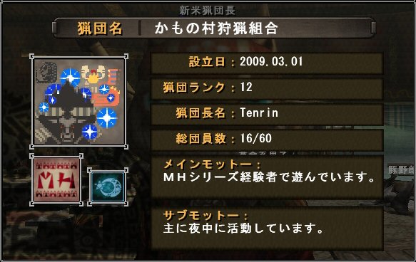 Q.猟団に加入申請したいのですが…… A,人として常識あるマナーを持つ団員を募集しています。 全チャ猟団勧誘見かけましたら個チャ・メールを! 求人区での活動では団員募集の部屋を立てています。 |